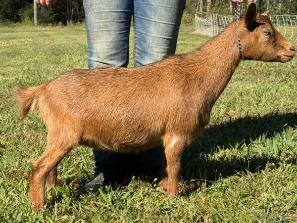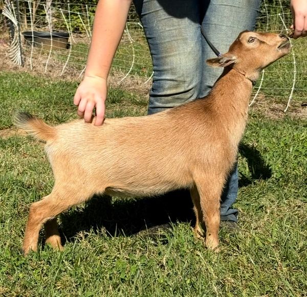 Joy is also one of my favorites here. Her sire is the very notable Agape's Prize Saint Dismus who had daughters place at 2024 nationals along with daughters who have 90+ LA scores. Her dam has an extraordinary mammary system which I hope to see in this girl when she freshens. She has been to one show so far this season and placed third behind her full sister and another Bella Rossa Estate doe. I can't wait to show her more this season!